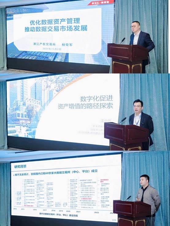 浙江产权交易所有限公司杨奇军董事长、杭州园钉科技有限公司王小玮董事长及中国科学院大学郝俊博士在数字经济与数据资产管理分论坛上分别就“优化数据资产管理推动数据交易市场发展”、“数字化促进资产增值的路径探索”及“集成学习与数据资产智能定价”等议题进行了精彩分享。