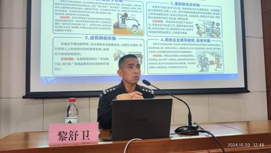 讲座上,黎舒卫通过大量鲜活案例,向与会人员分析了大学生当中易发高发如网络贷款、网络刷单、网络投资、网络交友、网络兼职、网络赌博、虚假购物、虚拟中奖、裸聊、冒充公检法、非法论文交易等电信诈骗类型以及帮信罪“十大类型”,要求同学们务必要提高警惕,不贪小便宜,不轻易向他人转账,不从事网络刷单、网络赌博、裸聊等违法活动,对自己的人身和财产安全负责。同时,针对相关非法宗教、网络安全、寝室矛盾纠纷、校园消防安全等案例,他要求同学们务必要增强安全意识和法纪法规,不参与任何形式的非法宗教活动,合法文明上网用网,不在任何网络空间发表任何不当言论,在校要和同学和睦相处,珍惜大学时光,努力学习,以优异的成绩回报家长、老师、学校和社会。