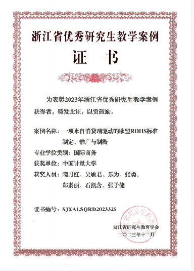 2 | 一项来自消费端驱动的欧盟ROHS标准制定、推广与制衡 | 案例 | 隋月红、 吴敏君(研究生)等 | 2023,入库浙江省优秀研究生教学案例 |