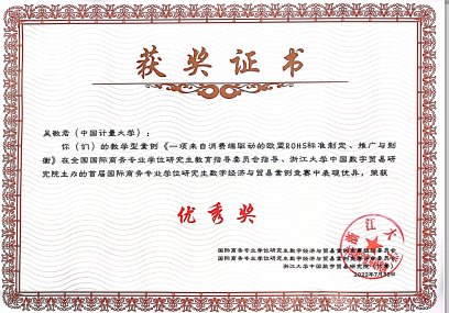 1 | 一项来自消费端驱动的欧盟ROHS标准制定、推广与制衡 | 竞赛 | 吴敏君(研究生),隋月红(指导老师) | 2022,全国国际商务专业研究生教指委数字贸易竞赛组 优秀奖 |