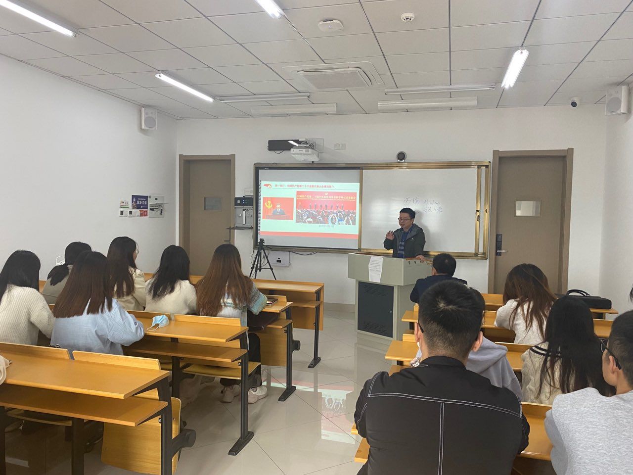 学院党委副书记陈骅化身讲解员,结合同学们的实际,先后从报告的主要内容、重要意义以及同学们应如何不负新时代,奋斗新征程对党的二十大报告进行了解读。“大家要坚定不移听党话、跟党走,怀抱梦想又脚踏实地,敢想敢为又善作善成。”陈骅寄语在场青年学生,不仅要迅速掀起学习宣传贯彻党的二十大精神热潮,而且要在全面学习、全面把握、全面落实上下功夫;要时刻牢记党员、团员身份,在学习宣传贯彻党的二十大精神方面走在前,带头学习,先学一步,学深悟透,通过学习,坚定理想信念,坚定不移听党话跟党走,立志做有理想、敢担当、能吃苦、肯奋斗的新时代好青年。