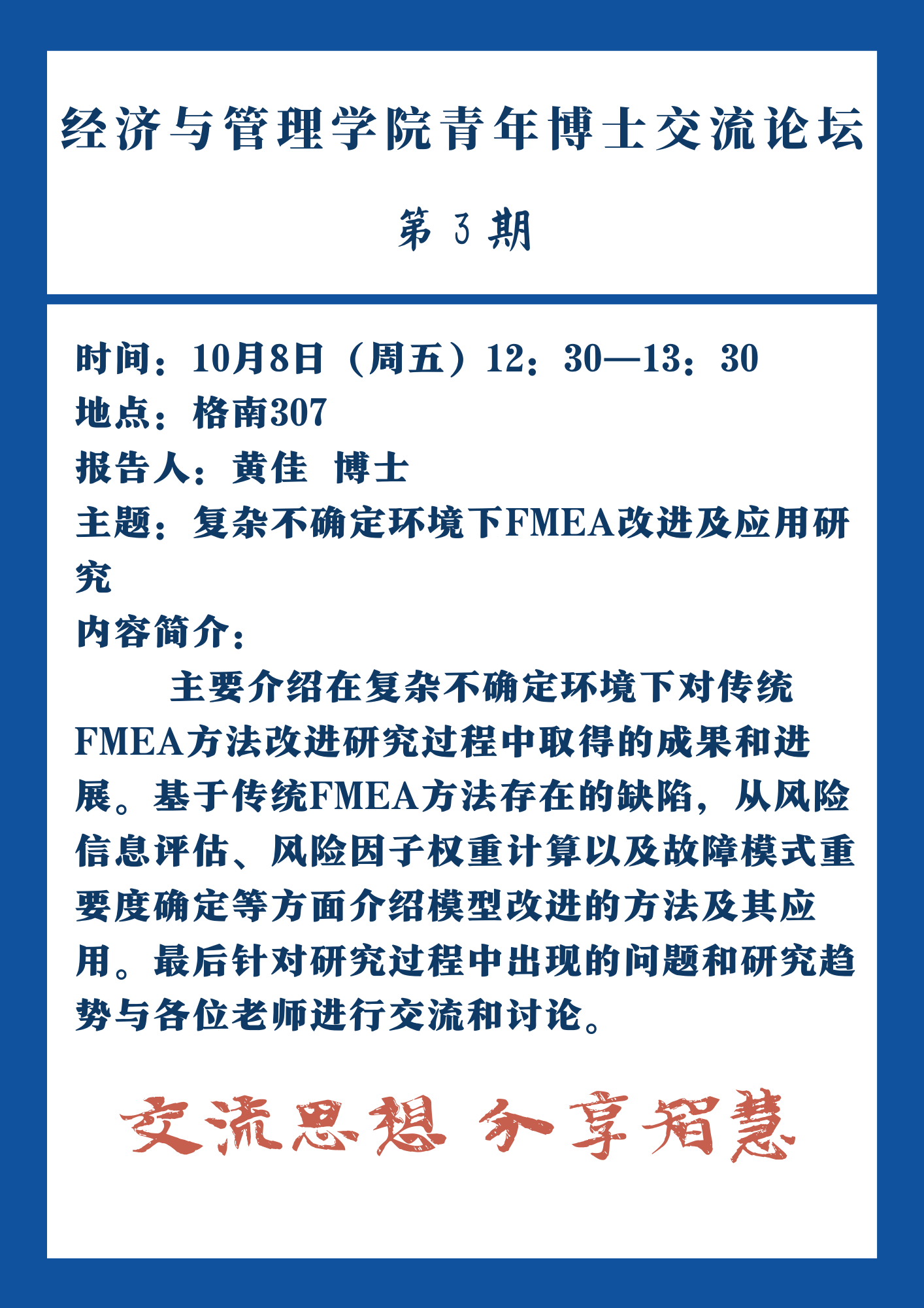 [10月8日]青年博士交流论坛第3期:复杂不确定环境下FMEA改进及应用研究