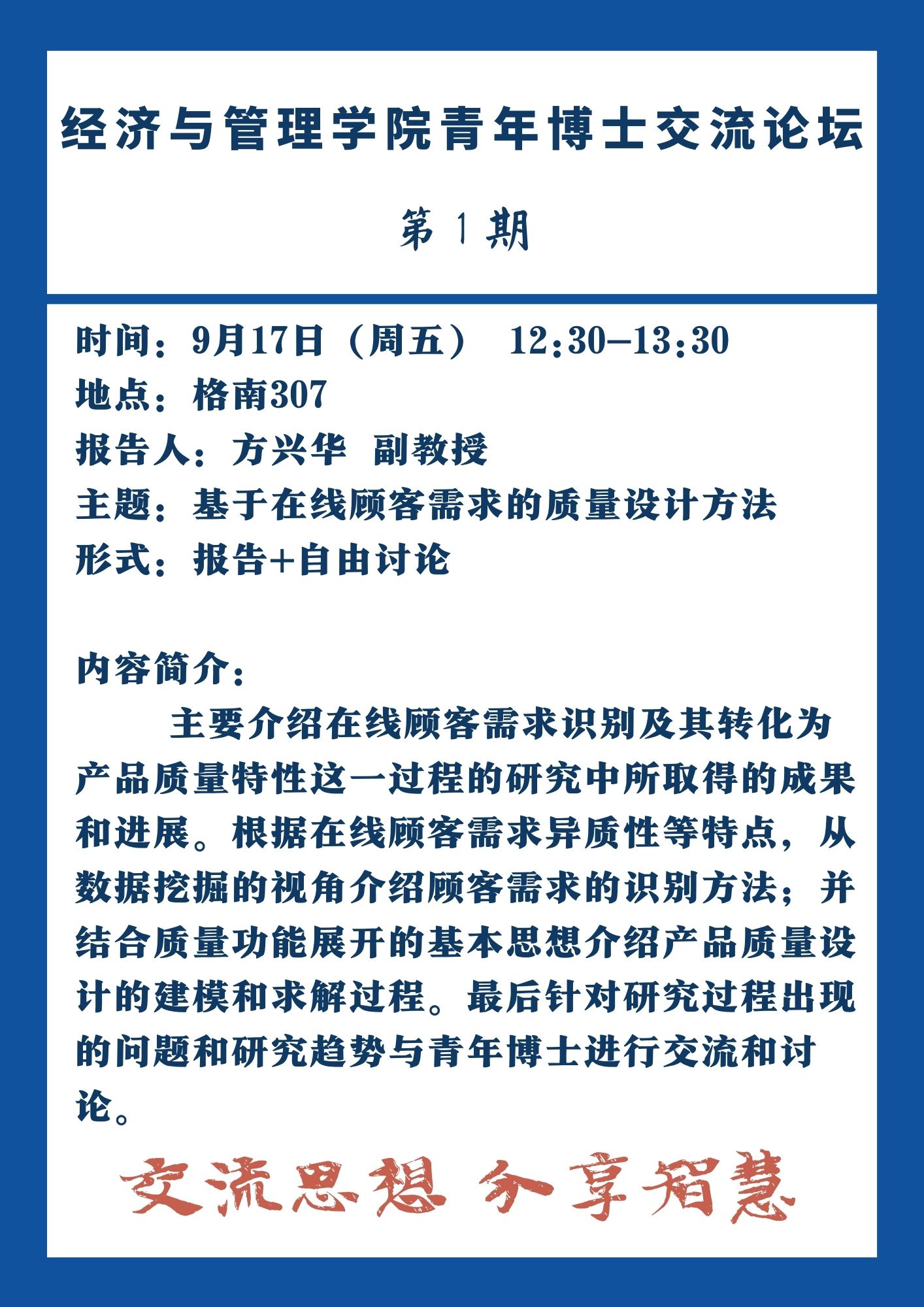 [9月17日]青年博士交流论坛第1期:基于在线顾客需求的质量设计方法