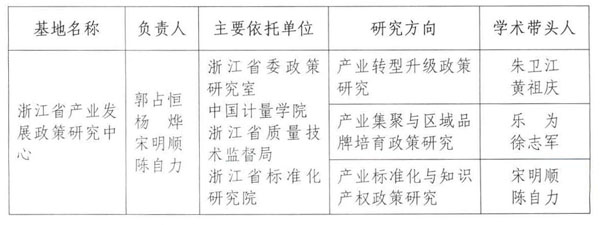 经专家评审,浙江省社会科学界联合会于2011年3月28日(浙社科联发【2011】14号)研究批准,浙江省委政策研究室、中国计量学院、浙江省质量技术监督局、浙江省标准化研究院联合申报的“浙江省产业发展政策研究中心”为浙江省哲学社会科学重点研究基地。这是我校金沙集团1862cc成色在获批浙江省高校人文社科重点研究基地之后的又一件喜事,该基地共设有三个研究方向,具体情况见附图。