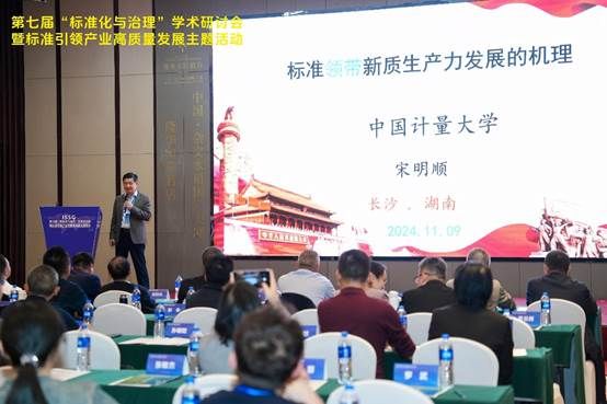 宋明顺教授在学术研讨会上发表“标准‘领’‘带’新质生产力发展的原理”的主旨演讲,报告内容从“新质生产力关键在质量”“标准化的领带作用机理”“作用取决标准‘私’性”等三个方面阐述标准制定的原则。报告强调了标准在推动新质生产力发展中的重要作用,为标准的制定和应用提供了重要的理论依据和实践指导。